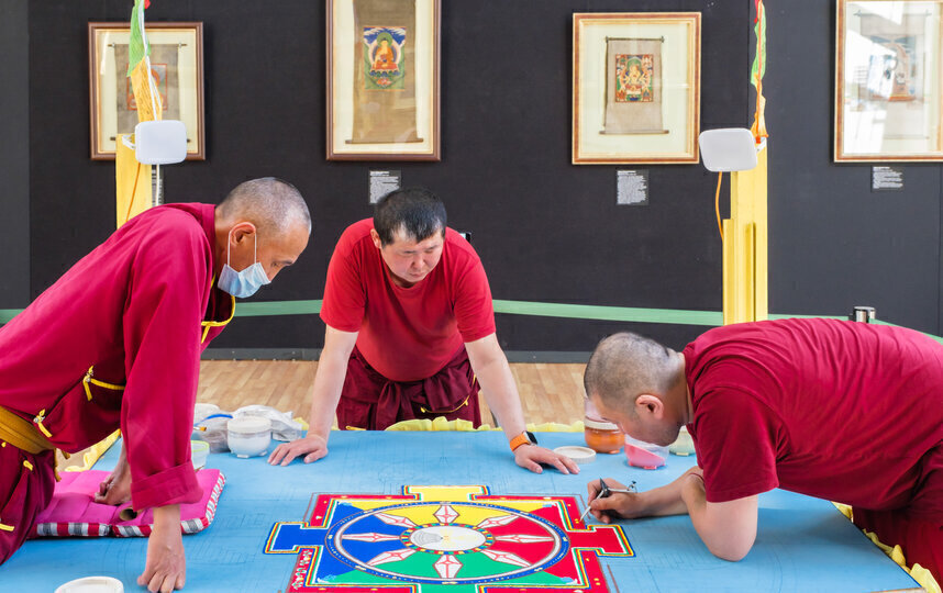 В течение недели посетители выставки могли наблюдать, как служители дацана – Соёл лама, Рабдан лама и Баир лама – кропотливо работают над созданием символической модели буддийской вселенной.