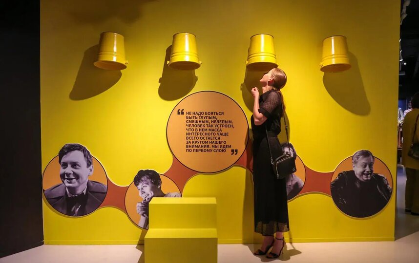 Олег Табаков относился к себе с иронией и умел сочетать несочетаемое и в жизни, и на сцене. Его задористый смех ни с каким другим не перепутать – на выставке ему посвящён целый стенд: заразительное "хи-хи" и хохот взахлёб слышатся из жёлтых, похожих на фены в советских парикмахерских, перевёрнутых ведёрок.
