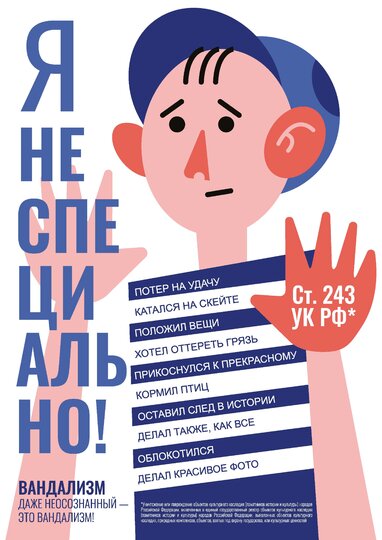 До сих пор некоторые гиды предлагают потереть какое-нибудь место петербургским памятникам, чтобы, например, наладилась личная жизнь. Почему-то я всегда знала, что счастливее от этого я не стану, а травму памятнику нанесу. А потом реставраторам придётся долго и кропотливо лечить скульптуру. Персонажем моего плаката стал ребёнок. Дети, наверное, наносят наибольший вред памятникам. И происходит это с подачи взрослых. Это они предлагают то присесть на бронзовую спину верблюда, то подержать императора за руку. Я решила ещё раз всем напомнить, как не стоит поступать.