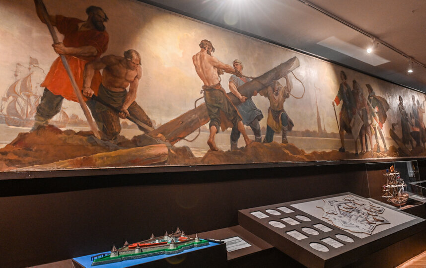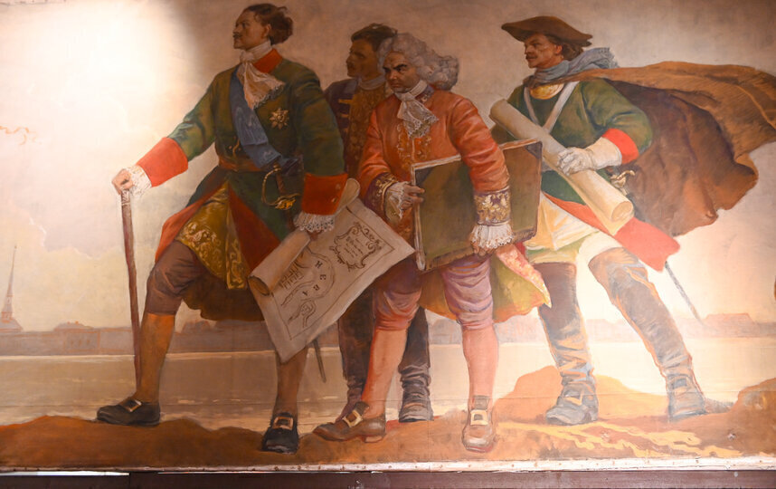 Практически на входе зрителей встречает один из главных экспонатов - девятиметровое полотно "Закладка Петербурга". Эта картина была специально написана в 1946-1947 годах для украшения Советского (Белого) зала Мариинского дворца. В 1993 году она оказалась в музейных фондах. Последний раз экспонировалась более десяти лет назад и впервые за последние годы будет показана в Петропавловской крепости.