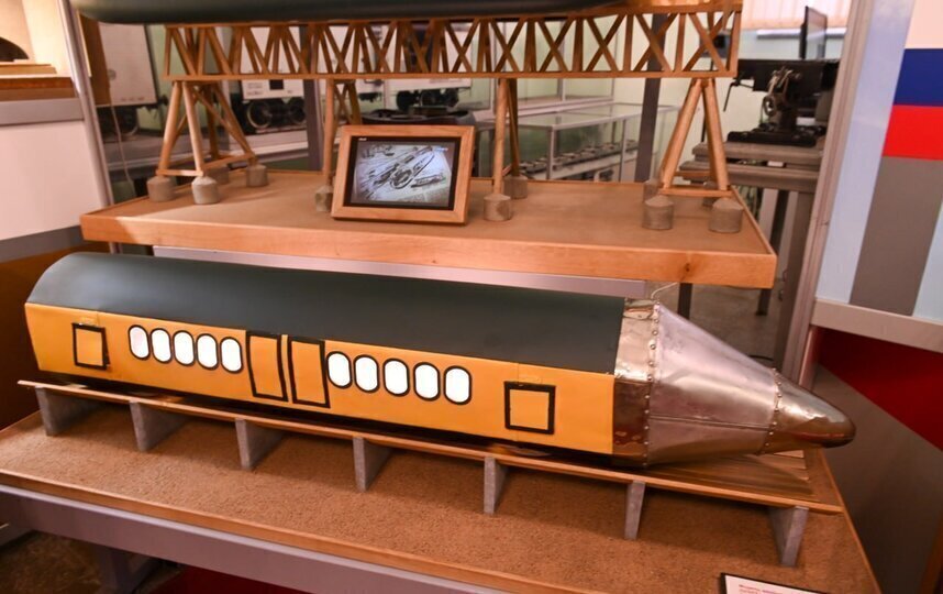 – По проекту он должен был разгоняться до 250–280 км в час. Внутри поезда вместо колёс двухметровые шары, которые вращались с помощью электродвигателя. Принцип – как белка в колесе. Ток подавался через контактную сеть. Проект 1933 года. Даже дали добро на строительство опытной дороги Москва – Ногинск, – говорит сотрудник музея.