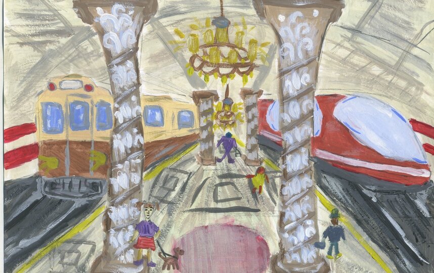 На картине "Встреча времён в "Автово" победитель конкурса Анастасия Федорова объединила две временные грани. На картине видно пересечение прошлого, где знакомые всем нам старые коричневые вагоны, и будущего, где уже похожие на "Сапсан" поезда.