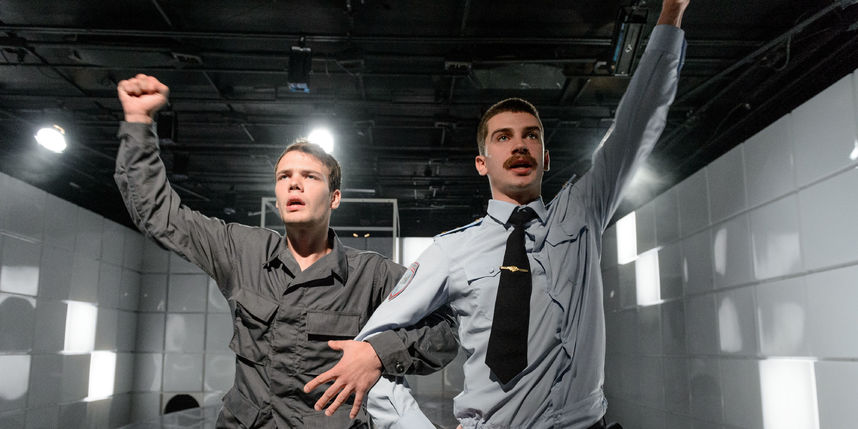 В театре "Практика" объединили две пьесы Дмитрия Данилова: "Человек из Подольска" и "Серёжа очень тупой" и получили задорный микс с размышлениями о том, как мы живём. Режиссёр спектакля – Марина Брусникина, а художник постновщик – Савва Савельев.