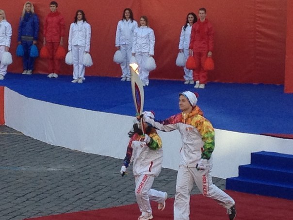 После того, как на Красной площади был дан старт эстафеты Олимпийского огня "Сочи 2014", священное пламя неожиданно погасло. Конфуз тут же был решен. Сотрудник ФСО, находившийся рядом с факелом, поджег пламя.