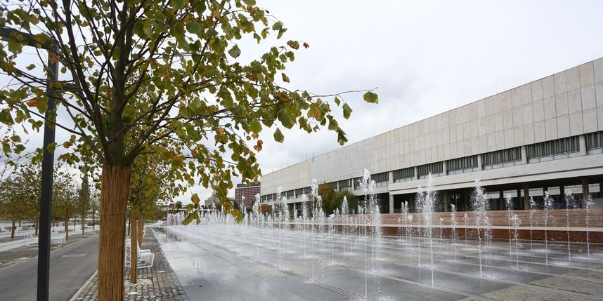 В глубине 60-метровый "сухой" фонтан, который вечером становится разноцветным. По нему можно будет свободно бегать, когда снова вернется тепло. Рядом в гранит вбиты дизайнерские кресла и столы из стальных прутьев, выкрашенные в белый цвет. Двигать их нельзя, зато ими можно пользоваться даже после дождя – вода с них очень быстро исчезает.