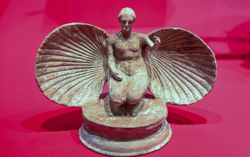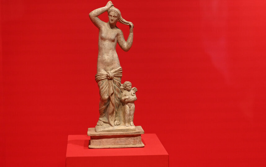 – В древнегреческой вазописи мы можем часто увидеть девушку, сидящую на коленях. Это невеста. На ней драгоценности, и она совершает обряд омовения перед вступлением в брак. Если вы обратите внимание, рядом на возвышении сидит Афродита. Благодаря её присутствию этот мир становится сакральным! В этот момент образ смертной невесты уже божественный! Она примеряет на себя роль самой Афродиты, – рассказывает научный сотрудник Отдела античного мира Мария Ненахова.