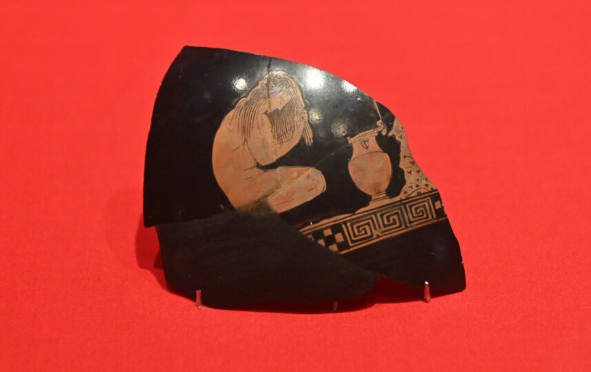 Свадебную реконструкцию ведут в том числе по изображениям на кувшинах, вазах, шкатулках. Они представлены на выставке. Фрагмент, вероятно, амфоры, по словам научного сотрудника, один из самых уникальных экспонатов. Его украшает невеста без одежды.