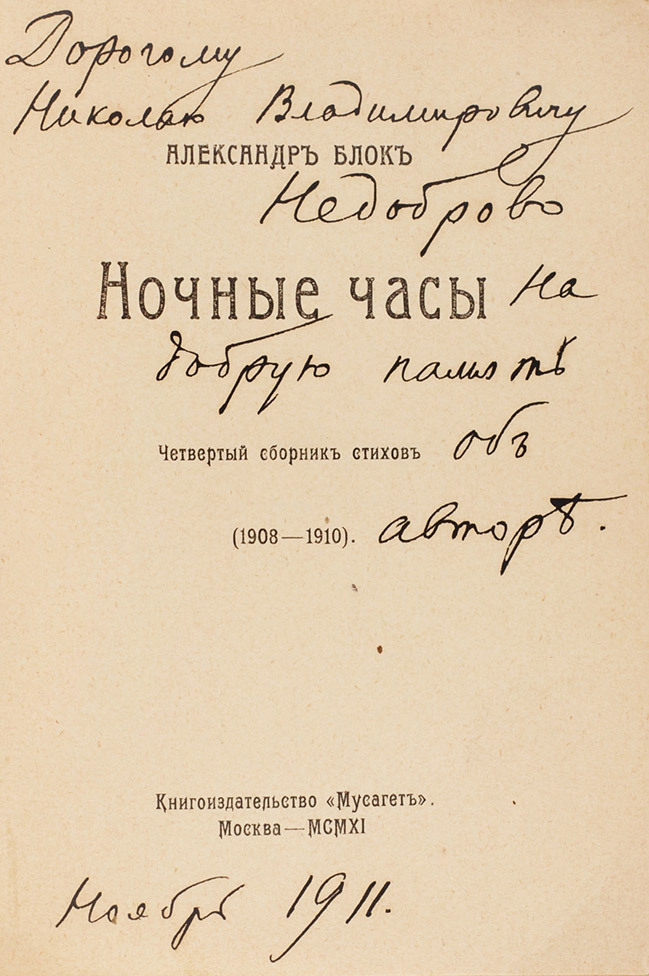В конце октября 1911 года издательство "Мусагет" выпустило сборник стихов Александра Блока "Ночные часы" тиражом в тысячу экземпляров. Блок получил 95 авторских экземпляров и раздавал их друзьям.