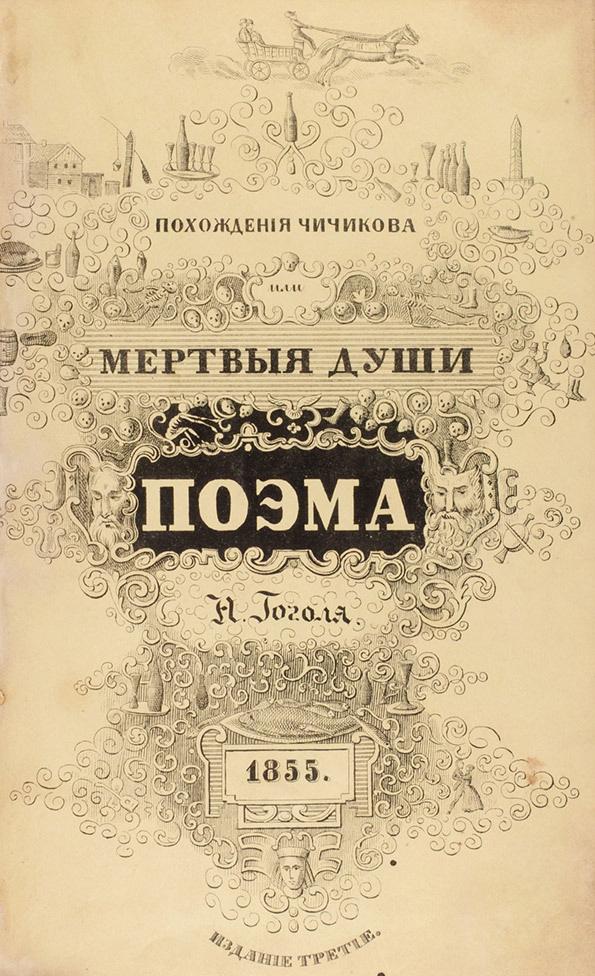 На торги выставлен первый том всем известного романа в третьем издании за 80 тысяч рублей. На рисунке писателя выделяется подзаголовок "Поэма", написанный крупными буквами на чёрном фоне. Гоголь подчеркивает, что идёт против литературных канонов, согласно которым поэмы пишутся стихами, а романы – прозой.