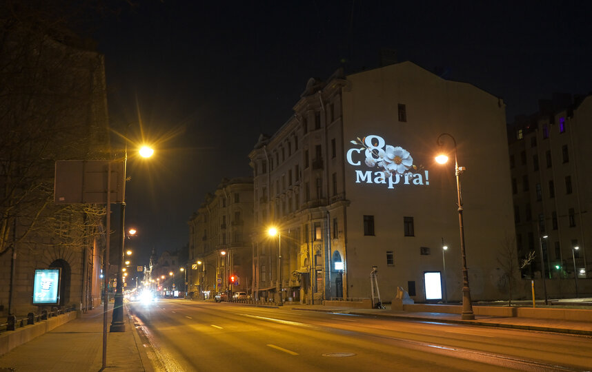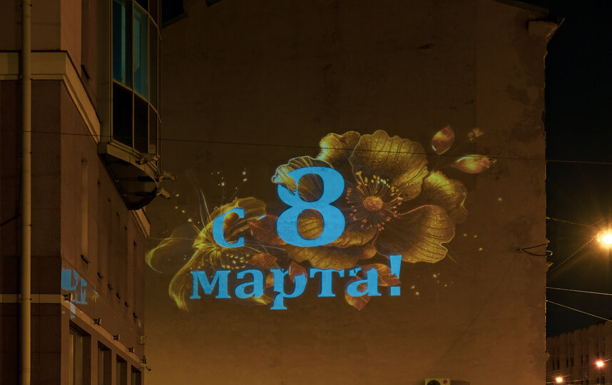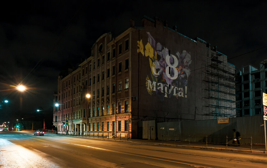 Как сообщила 7 марта пресс-служба Смольного, цветами из света смогут полюбоваться жители Петербурга. Световые проекции, посвященные 8 марта, включат накануне праздника – в 18:50 7 марта, а выключат – в 7:30 10 марта. Их можно будет увидеть на Московском пр., д. 91, 8–й линии ВО, д. 85, Большом пр. ВО, д. 70, Каменноостровском пр., д. 26–28, Шпалерной ул., д. 44, Кондратьевском пр., д. 14, наб. Обводного канала, д. 89, ул. Федюнинского, д. 16 (Ломоносов), Новгородском пр., д. 10 (Шушары).