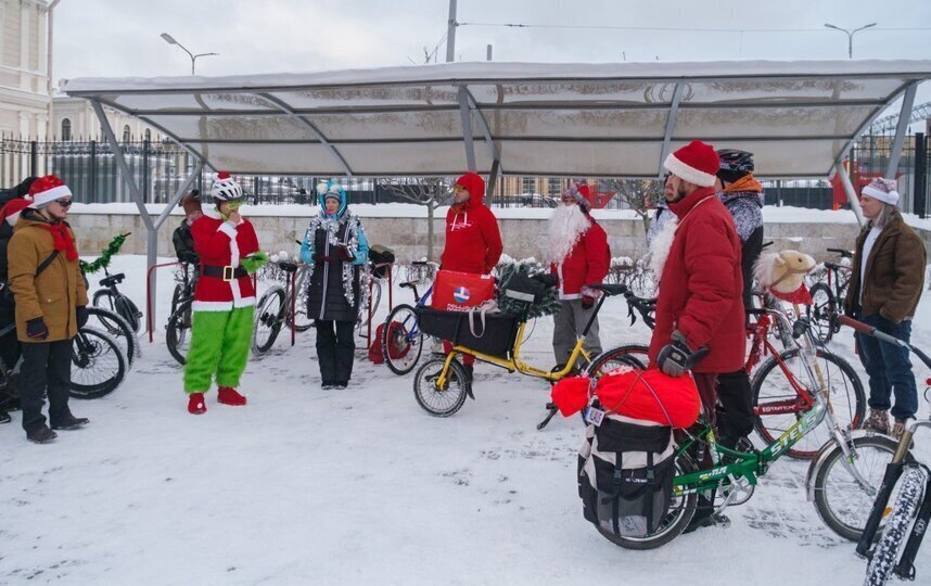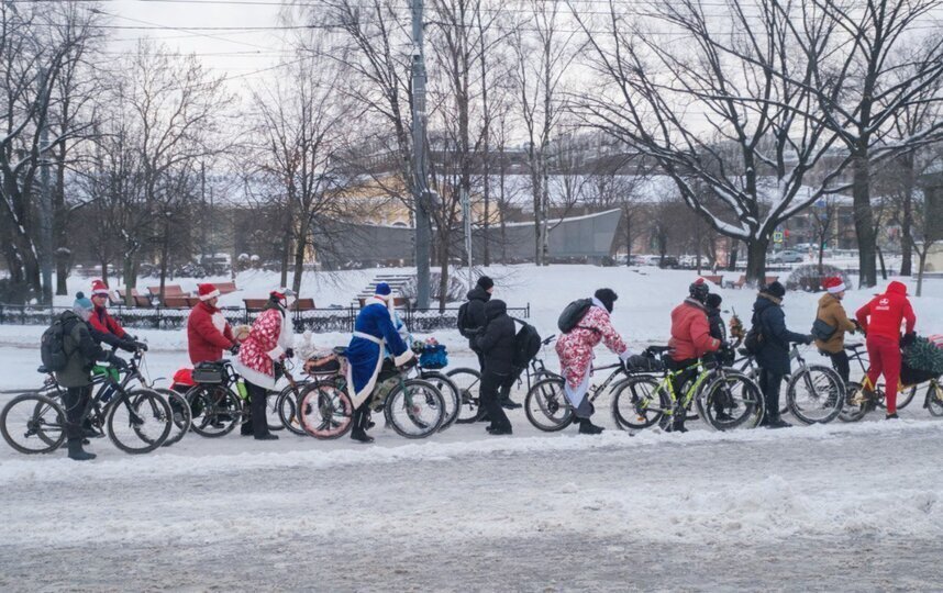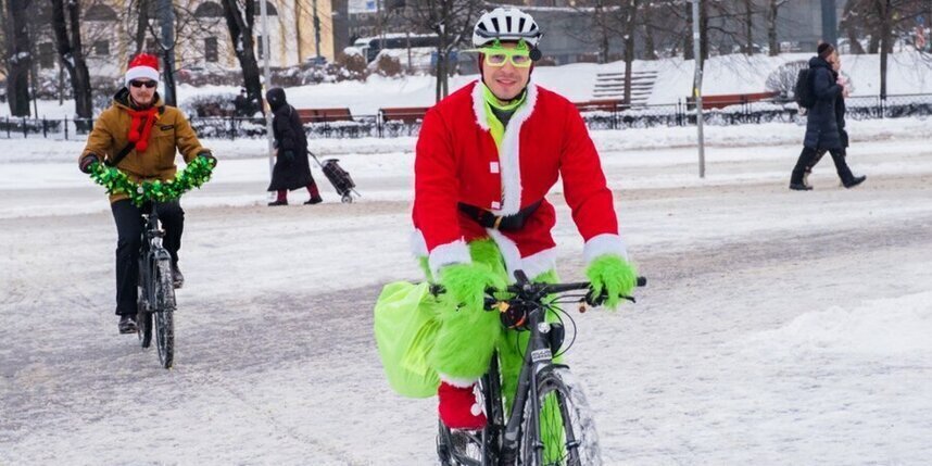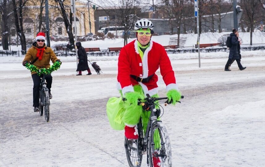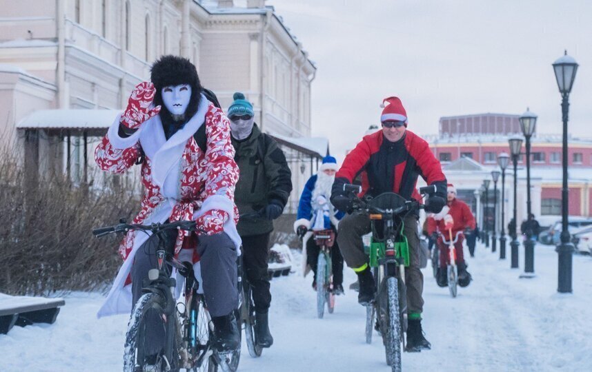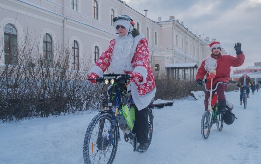Большинство велосипедистов приехали в образе Деда Мороза или Санта-Клауса. Но были и исключения. Петербурженка Анна каталась по Петербургу в костюме космонавта.