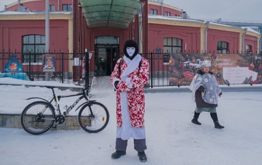 Дмитрий приехал на велопробег в костюме скандинавского Деда Мороза. А Влад - в белой маске.