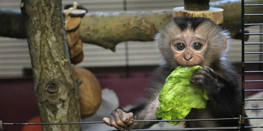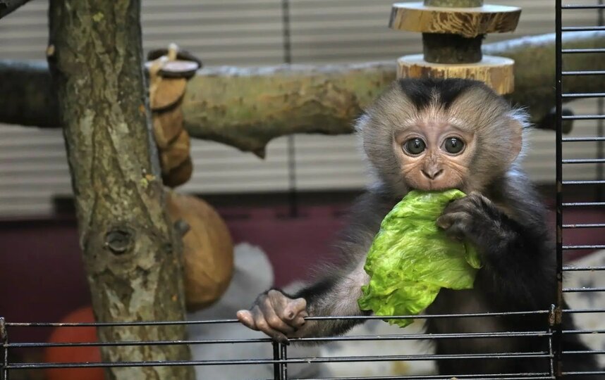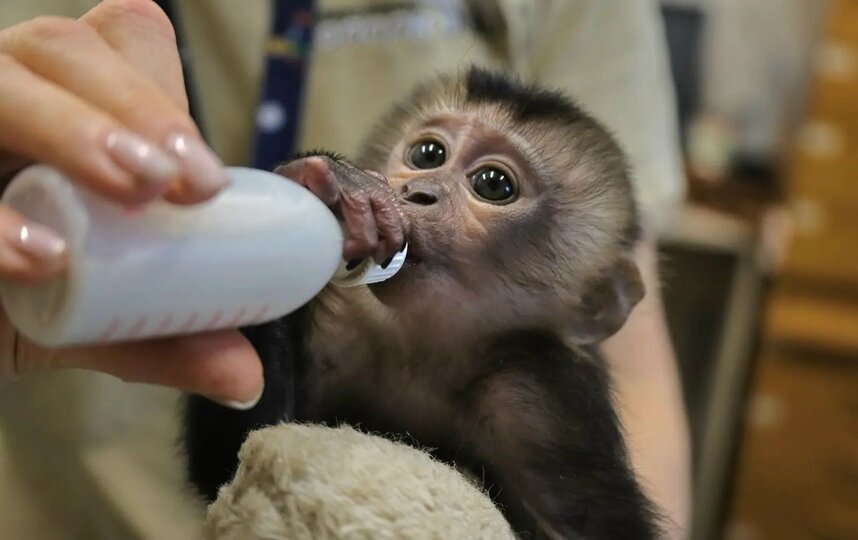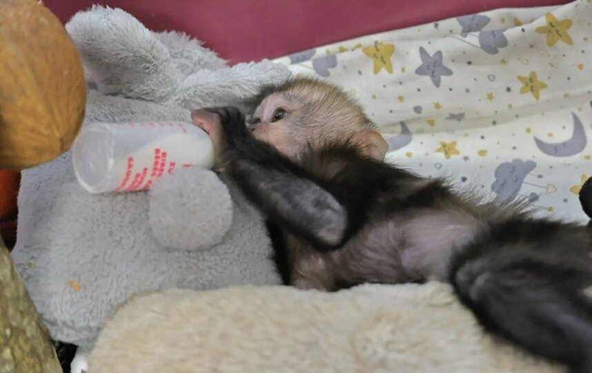 Маленькая львинохвостая макака (вандеру) появилась на свет 22 декабря 2025 года, а уже через три дня оказалась на руках у сотрудников Ленинградского зоопарка.