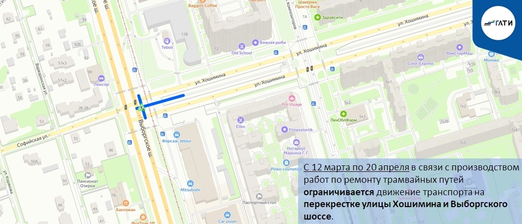 Как сообщили 10 марта в Государственной административно-технической инспекции (ГАТИ), с 12 марта по 20 апреля автомобилистам будет трудно проехать на перекрестке улицы Хошимина и Выборгского шоссе. Там запланирован ремонт трамвайных путей.