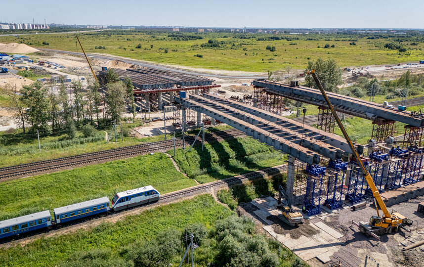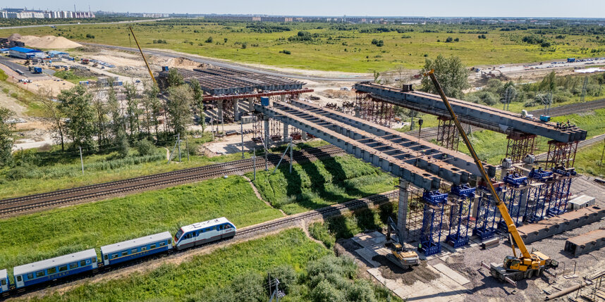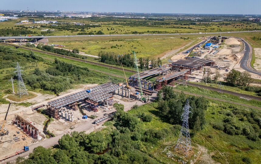 Сейчас рабочие монтируют металлические элементы пролётных сооружений. Для возведения путепровода, пересекающего железнодорожные пути, потребовалось установить девять опор высотой от 10 до 15 метров. Об этом сообщили в пресс-службе Смольного.