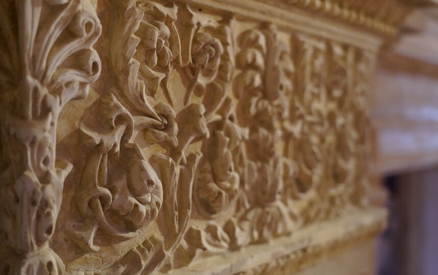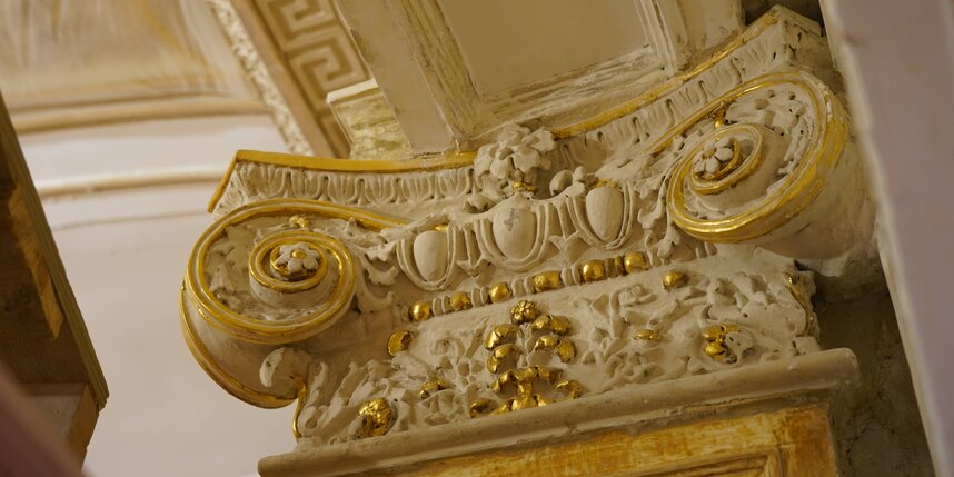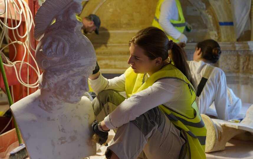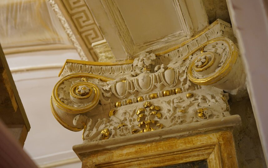 Кроме того, проводится реставрация гипсовых бюстов героев античной мифологии на консолях в арочных проемах, гипсовых скульптур "Римский воин" и "Греческий воин", а также лепного фриза "Триумфальный въезд Александра Македонского в Вавилон".