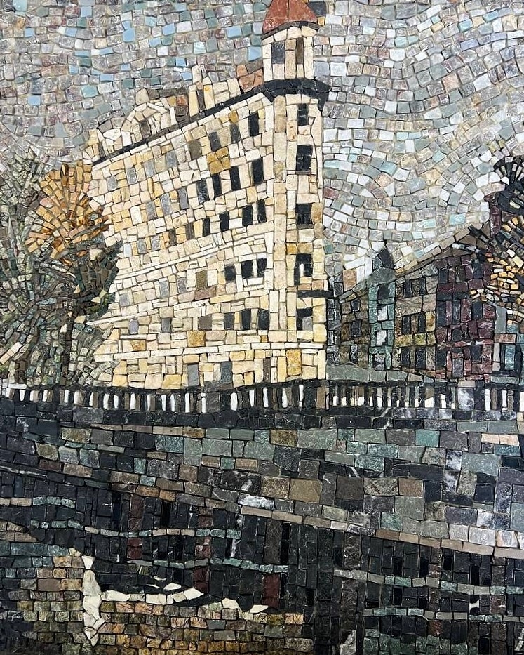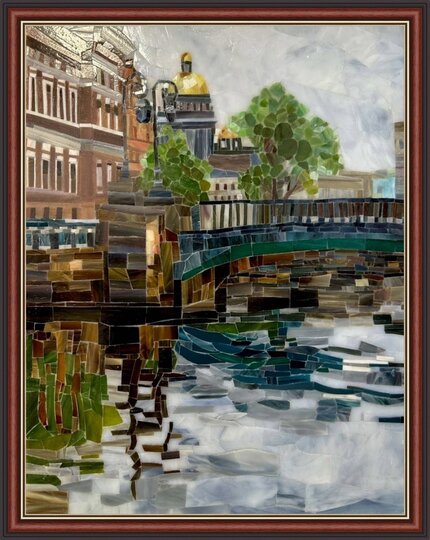 Многие мозаики не столько фиксируют вид, сколько передают настроение: утренний свет над водой, зимнюю тишину, отражения в окнах, вечернюю мягкость цвета. Это взгляд на город через личный опыт.