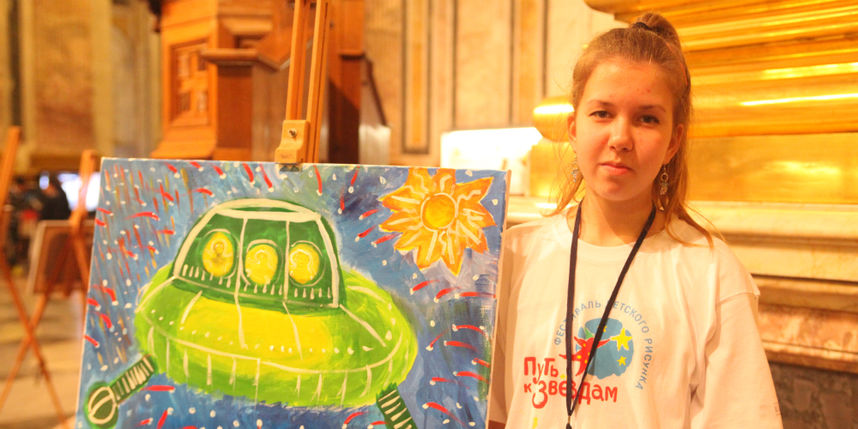 Мольберты для шестидесяти маленьких художников из детских домов Петербурга установили внутри Исаакиевского собора. Каждому выдали краски, кисточки. Задание было не из простых - нарисовать картину на тему космоса. Большинство детей посещают различные изостудии в своих детских домах. Но были и исключения. Как, к примеру, 12-летняя Даша Аксенова из колпинского детского дома N 27. За три часа она нарисовала изумительную картину. Яркую, сочную.