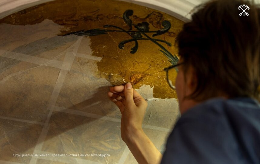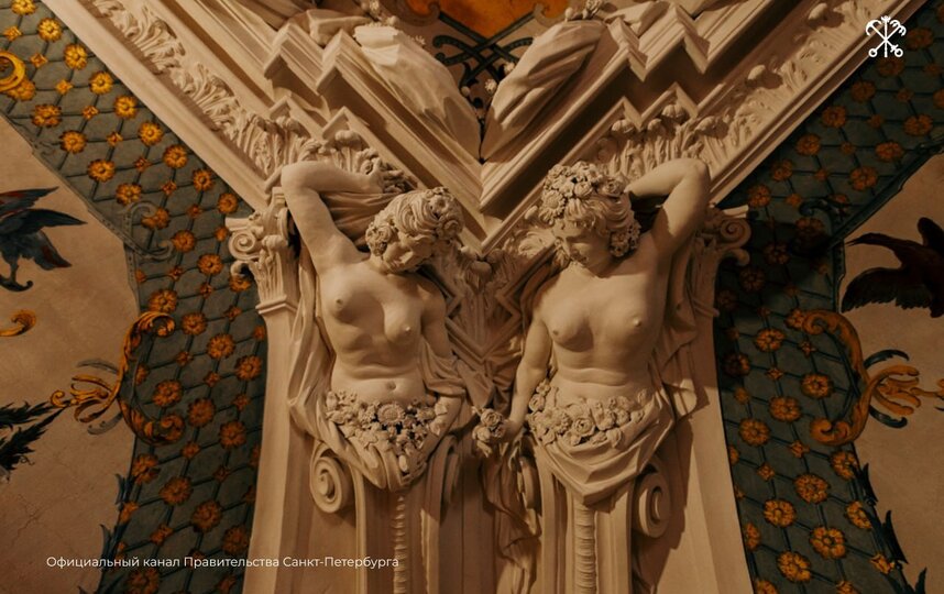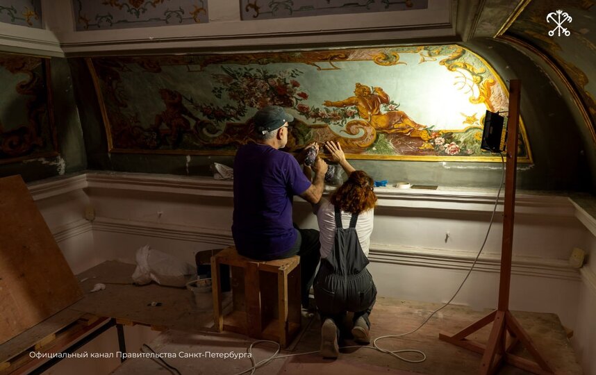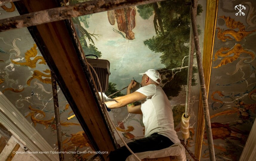 Сейчас специалисты тщательно обновляют лаковые панно, живопись на плафонах и падугах, полы, стены и двери. Также они очищают лепной декор на потолках. Это можно увидеть на фото ниже.