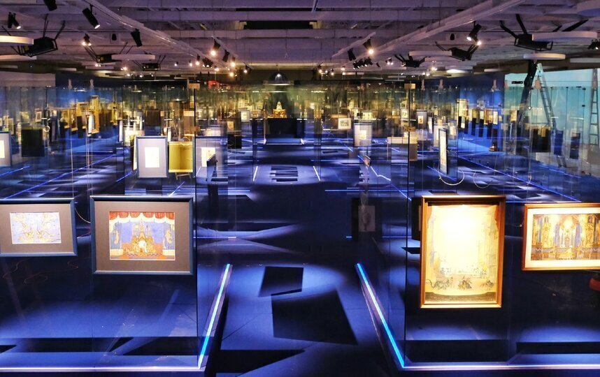 Чтобы попасть в мир "Азбуки", зрители должны пройти через стеклянный лабиринт, посвящённый театральному наследию Александра Бенуа.