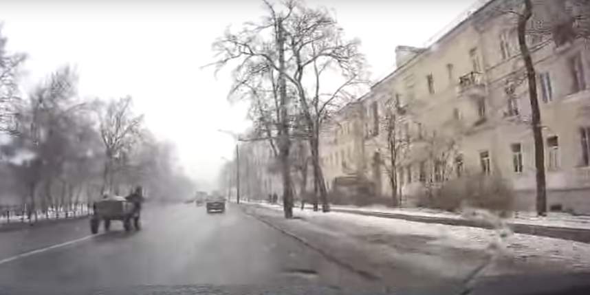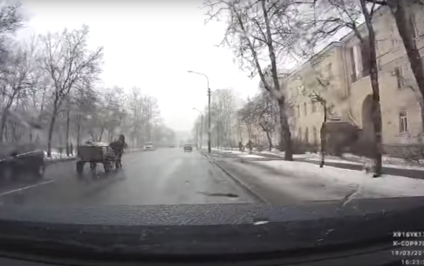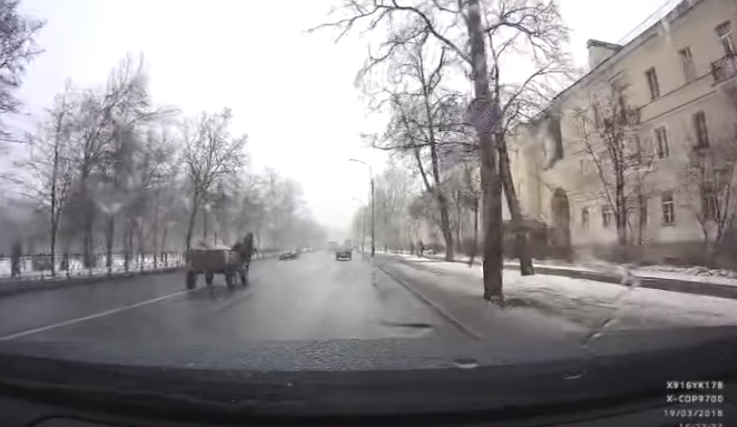 На кадрах видно, что лошадь с телегой выбежала на перекресток напротив Свято-Троицкой церкви в Красном Селе с улицы Первого Мая и направилась по проспекту Ленина. При этом лошадь постоянно пересекала сплошную линию и металась с левой полосы движения на правую.