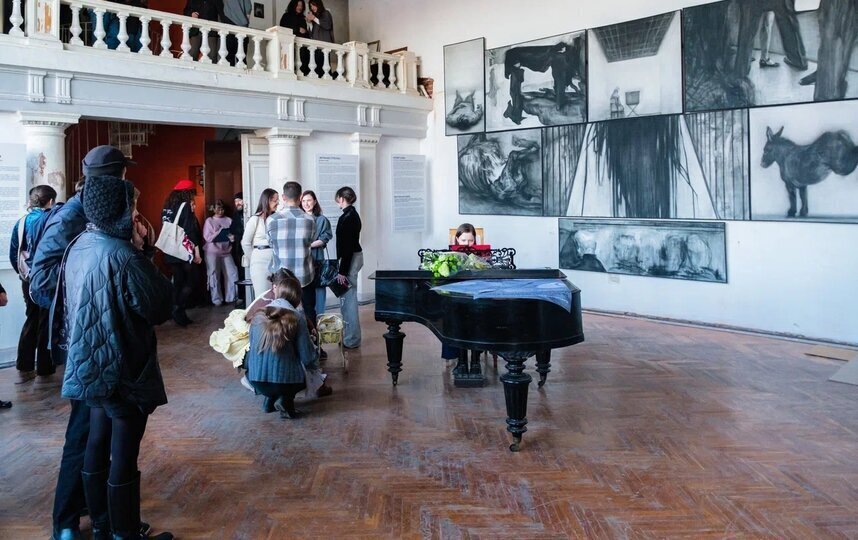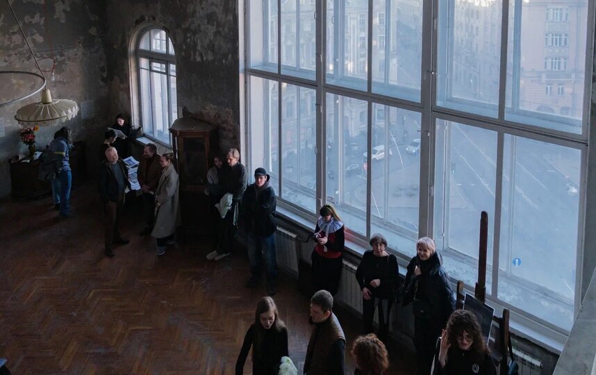 Работы участников выставки можно увидеть во всем многоуровневом пространстве мастерской-квартиры