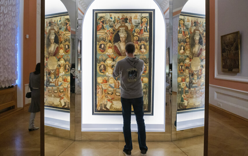 Масштабную экспозицию разделили на множество тематических блоков. Портреты церковных иерархов, изображения фрейлин и статс-дам, представителей светского общества, государственных деятелей, писателей и артистов, а также семейные и детские портреты.
