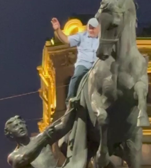 "Оседлав" фигуру коня, неизвестный махал руками и принимал позы для кого-то снизу. Когда он слезал с монумента, то наступил на руки бронзового укротителя и облокотился на его голову.
