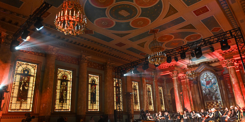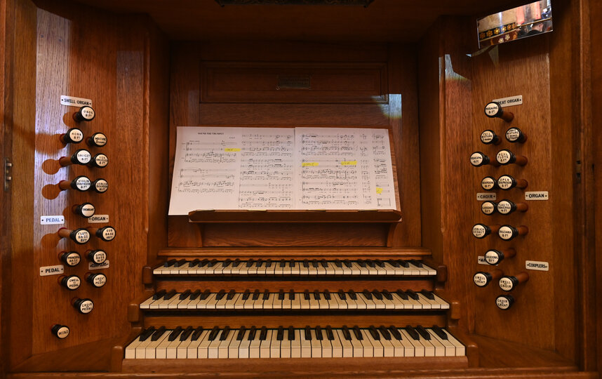 Отреставрированные витражи с апостолами сверкают в свете софитов. В углу притаился старинный орган. Музыкальный инструмент XIX века был создан в Великобритании, в городе Шеффилд.