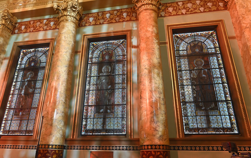 – В этом здании очень много подлинного, потому что это федеральный памятник архитектуры. Охраняется вот эта роспись потрясающая на потолке и пилястрах, лепнина, колонны, мозаики английской работы. Всё, куда вы роняете взгляд, – это старина и наше с вами историческое наследие, – говорит Юлия Стрижак.