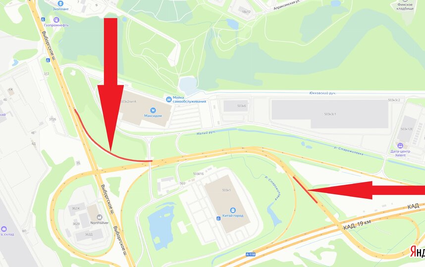 Объехать перекрытия можно будет через разворотную петлю с внешнего на внутреннее кольцо КАД, расположенную на 17 км в районе складов и через дорогу в районе гипермаркета.