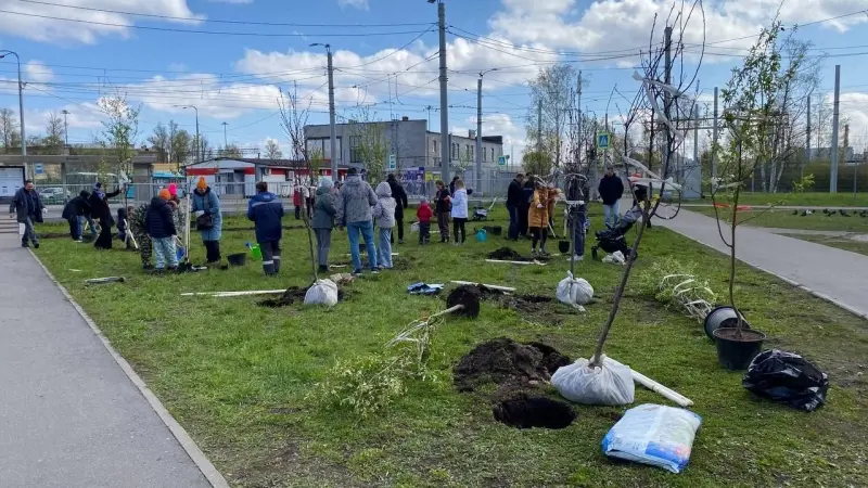 "Сад памяти" посадили на Ржевской площади в Петербурге. 25 яблонь начали расти в рамках международной акции рядом с железнодорожной станцией "Ржевка".