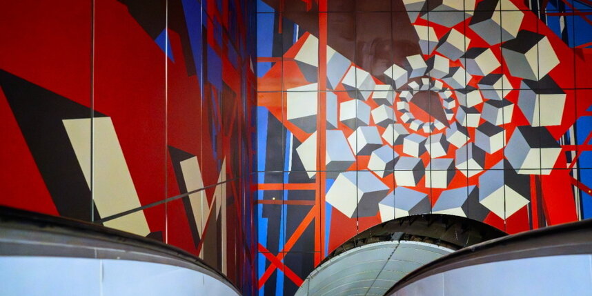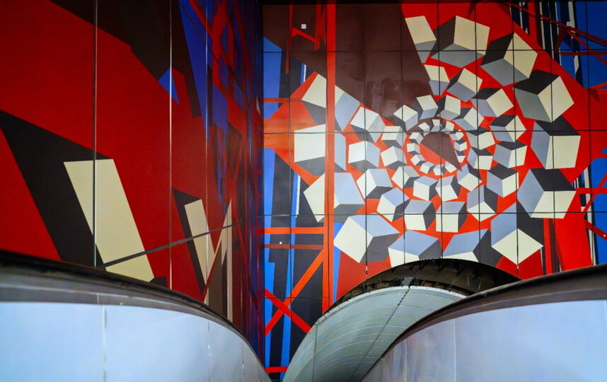 Как сообщает Смольный, композиция изготовлена из сотовых алюминиевых панелей с нанесенной печатью и расположена над эскалаторами.
