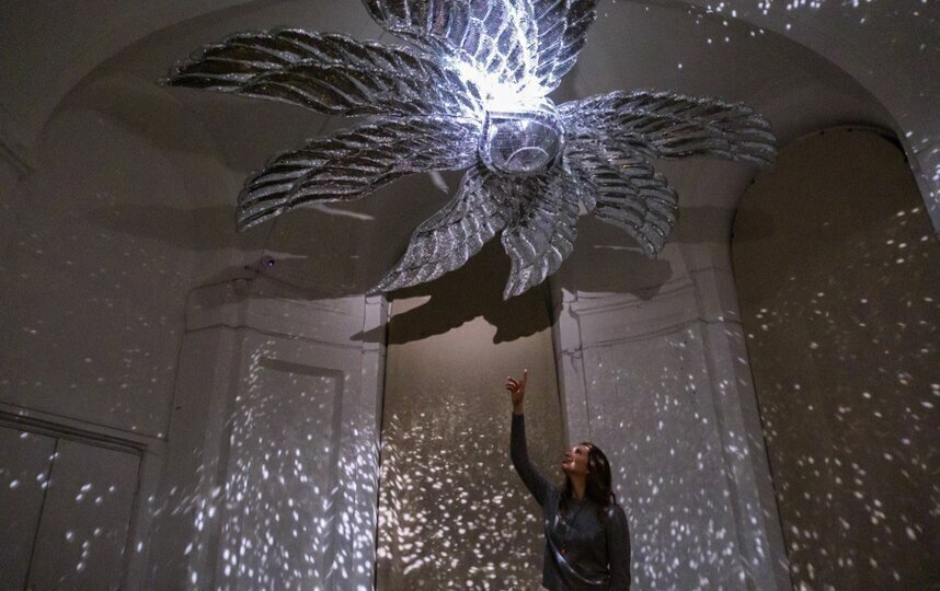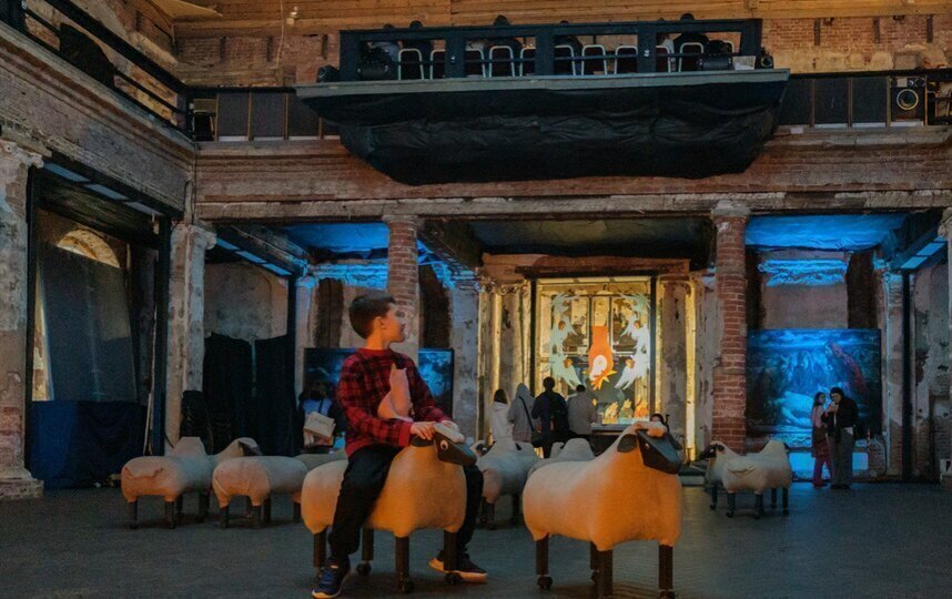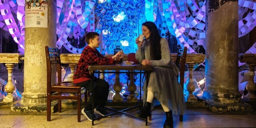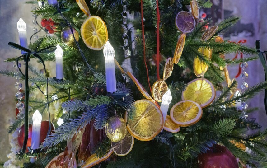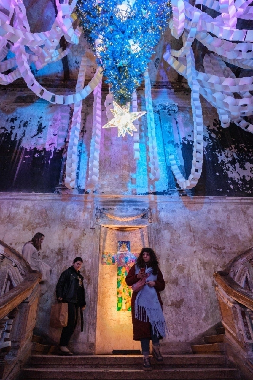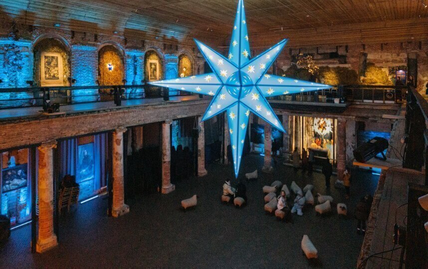 В вестибюле гостей встречает знаменитая перевернутая елка, украшенная сотней бумажных гирлянд. В течение месяца их делали волонтеры под руководством художников Арт-группы "Зерно". Чтобы создать рождественское и новогоднее настроение, им потребовалось 1000 листов ватмана.