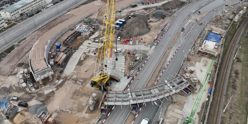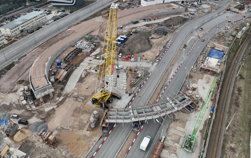 Как сообщили 30 апреля в пресс-службе Смольного, длина балки составляет 43 метра. Монтаж конструкции выполняли с помощью крана грузоподъёмностью 600 тонн.