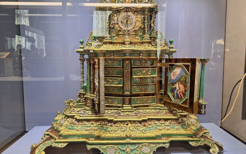 – Это настольный кабинет Петра Великого. Он был привезён императором из Амстердама в 1716 году. Приобретён у аптекаря Альберта Себы, который помогал императору создавать коллекцию Кунсткамеры. Золотая табакерка рядом была подарена Петру I саксонским курфюрстом Августом Сильным. С внутренней стороны крышки – портрет обнажённой возлюбленной Августа Сильного Авроры Кенигсмарк в образе Леды (персонаж древней мифологии).