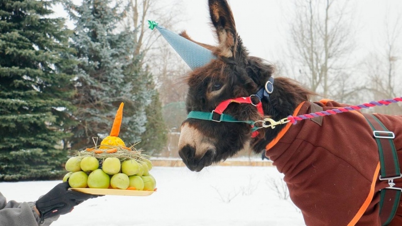 В честь знаменательного дня киперы угостили Бурашка его любимым лакомством - яблоками с морковкой на подложке из сена. Ослик быстро смекнул, что это всё для него и начал уминать вкусности.