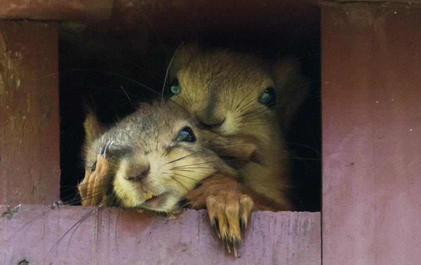 Тем не менее, подросшие бельчата жержатся вместе. Днем скачут по лесопарку, а к вечеру собираются в беличьих домиках. Очень радуются друг другу, обнимаются, как будто не виделись месяц.