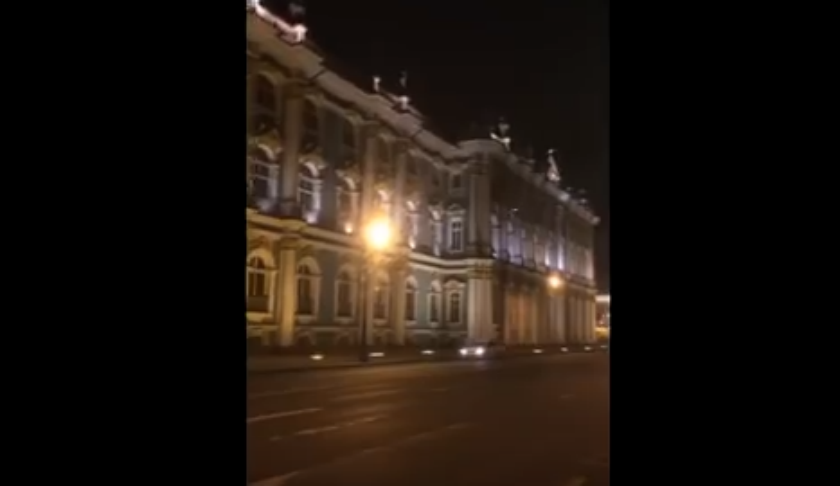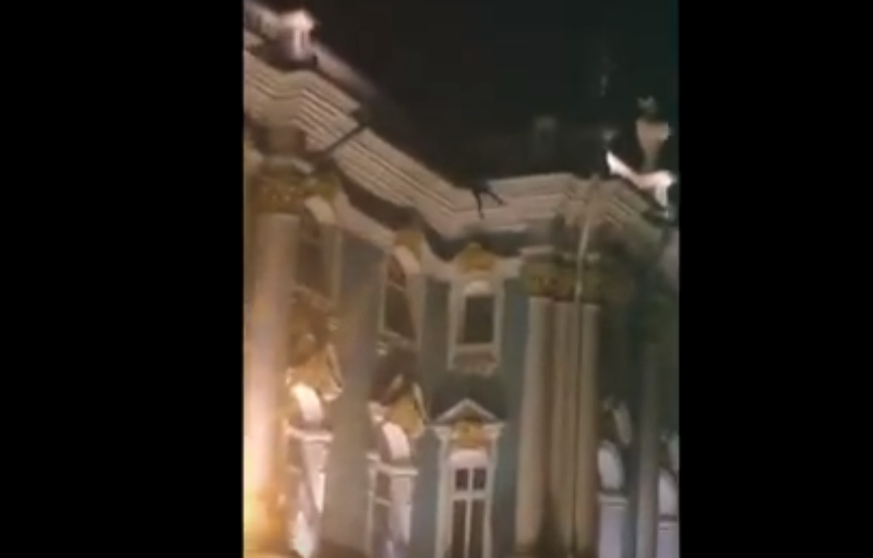 Забрались юные руферы на крышу Эрмитажа, судя по всему, по водосточной трубе. Однако в какой-то момент видно, что один из участников похода повис прямо над дорогой - он цеплялся за козырек крыши, едва не упав на асфальт.