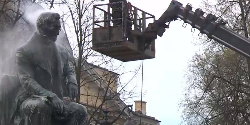 С памятника драматургу на Пионерской площади у ТЮЗа убирали пыль и грязь. Высота скульптуры составляет три метра, а постамента – почти четыре. Чтобы помыть такой большой памятник, работникам нужна была 30-метровая вышка. Добавляют былого блеска бронзовому монументу с применением нейтрального пенного раствора.
