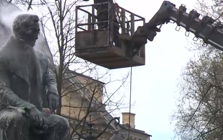 Выездную помывку для Александра Грибоедова организовали сотрудники Музея городской скульптуры. Об этом сообщает телеканал "Санкт-Петербург".