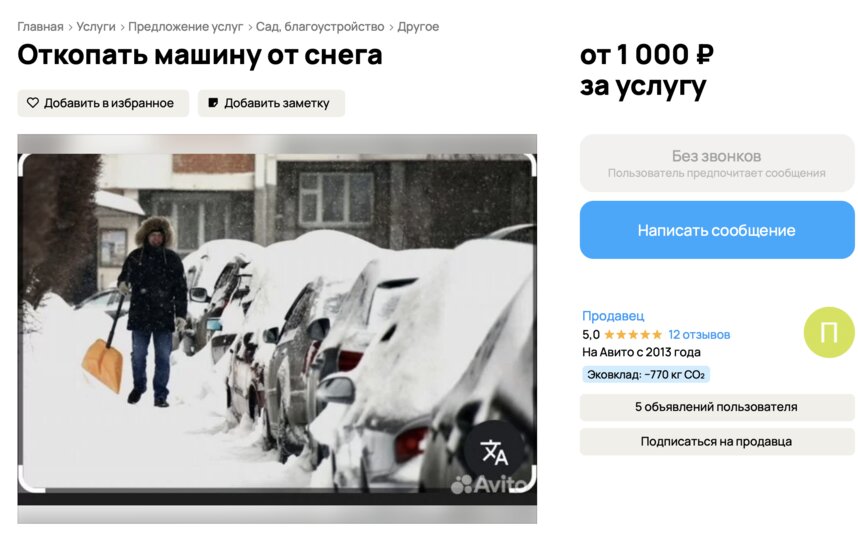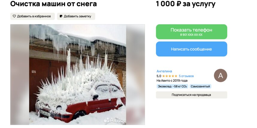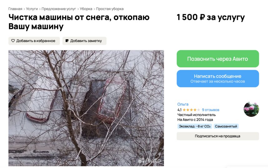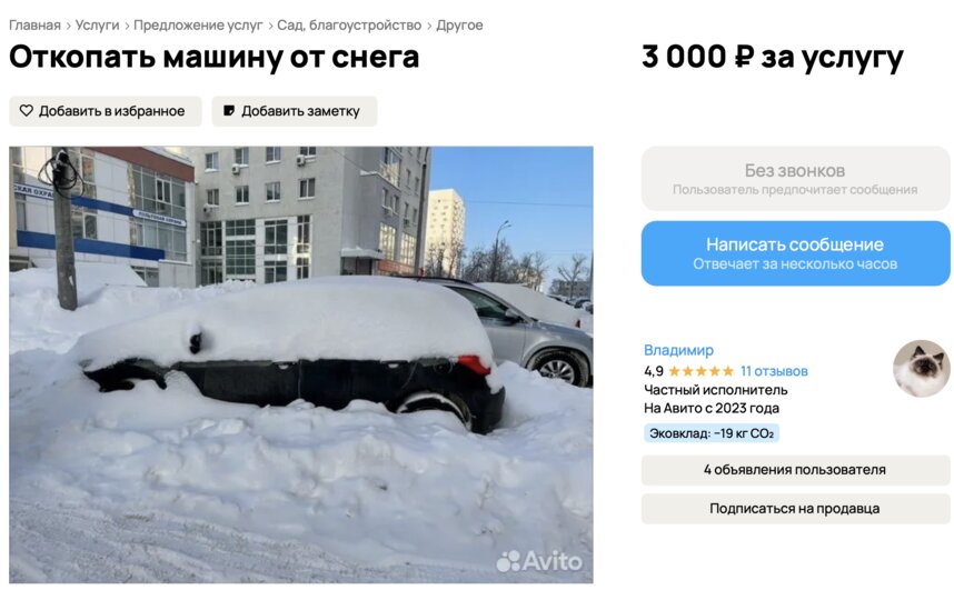 Как отмечают в объявлениях, спрос рождается из нежелания горожан заниматься тяжелой работой на холоде: "Не мучайтесь сами, оставьте это мне!" Стоимость услуг варьируется в зависимости от объема работы и срочности и в среднем составляет от 1000 до 3000 рублей.