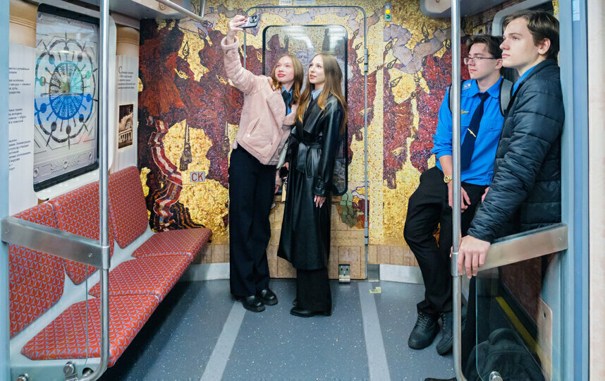 На стенах вагонов изображены достопримечательности и исторические моменты, связанные с районами города, а каждая станция обозначена своим оригинальным значком. Пассажиры этого поезда могут увидеть не только красочные панно, но и более тысячи архивных фотографий, которые рассказывают об истории метро и Санкт-Петербурга. "Над проектом мы работали около года, – рассказывает дизайнер Екатерина Мурай. – Документы предоставили метрополитен, Метрострой, Академия художеств, Русское географическое общество и многие другие. Например, вагон "Технологический институт" посвящён учёным, чьи профили мы видим на барьельефах".