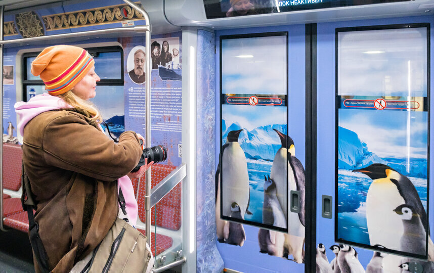 Вагон, посвящённый станции "Балтийская", рассказывает о путешествиях и путешественниках. Здесь можно погладить пингвинов и тюленей, прочесть интересные факты о жизни знаменитых этнографов.