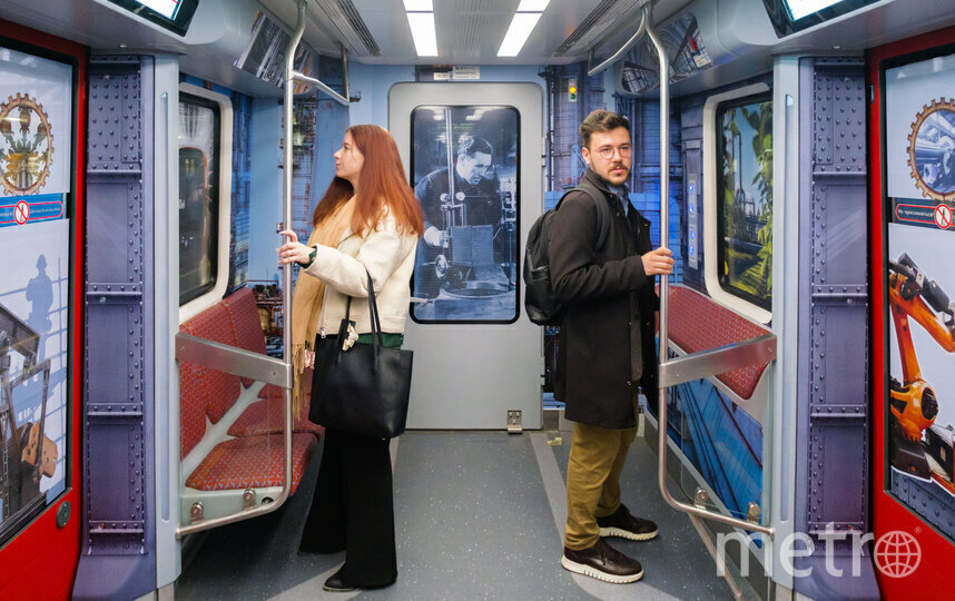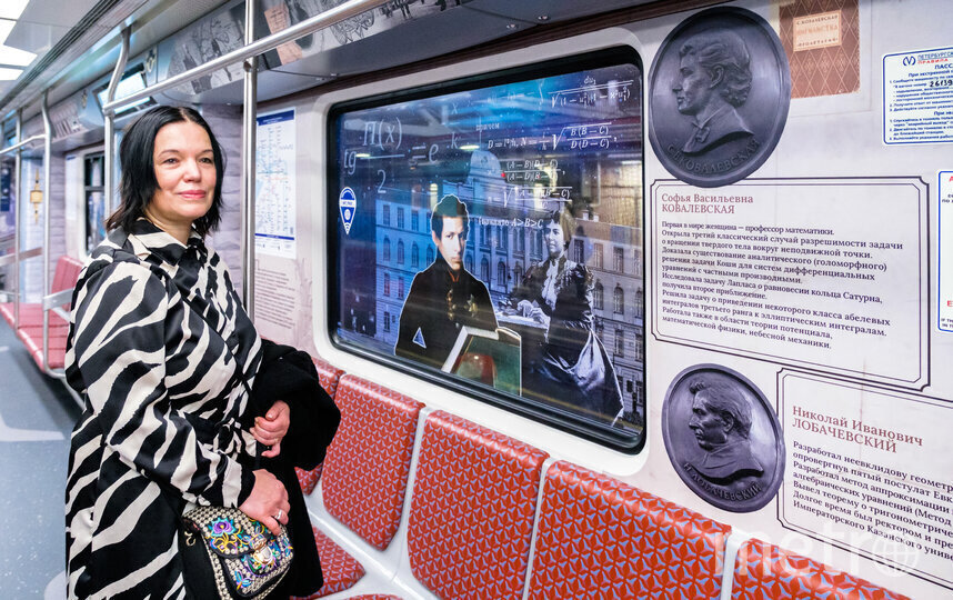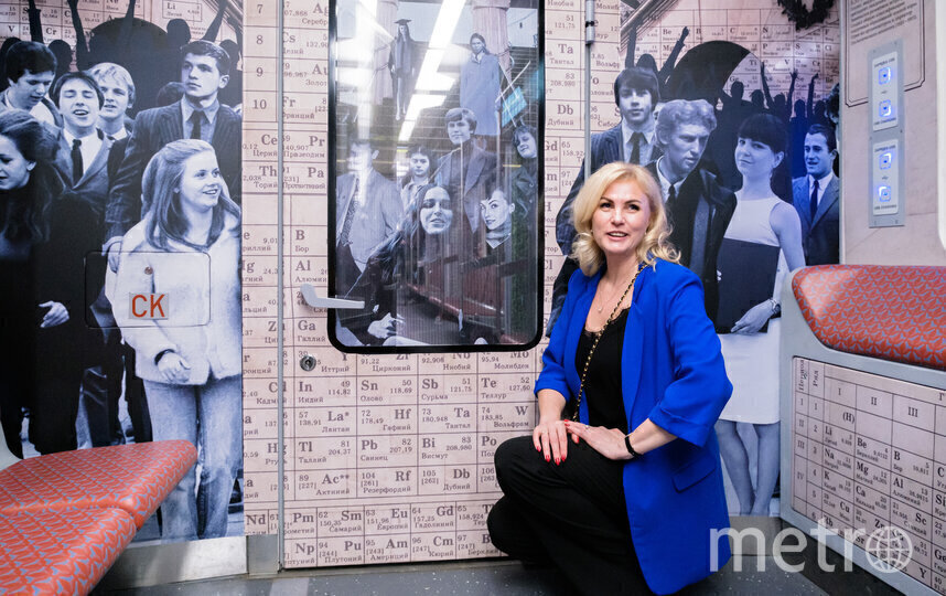 Руководитель пресс-службы Санкт-Петербургского метрополитена Юлия Шавель в вагоне, посвященном станции "Технологический институт"