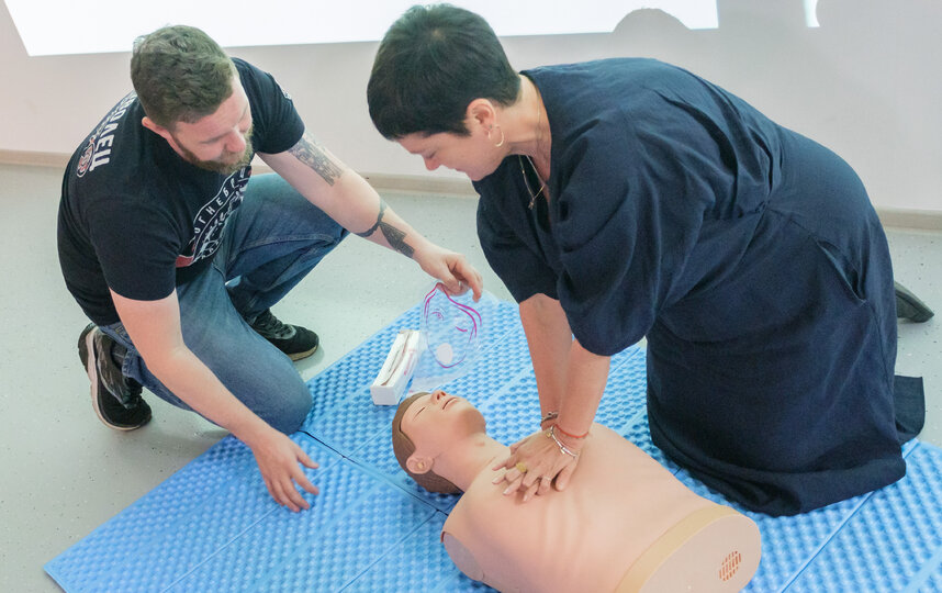 – Надавливаем на тело пострадавшего прямыми руками всем весом. Мы нажимаем на сердце, и кровь из него выбрасывается в головной мозг. Продавливаем на 5–6 см, – объясняет инструктор. – Компрессии мы должны делать с частотой 100–120 ударов в минуту. В жизни это никак не подсчитать. В 1980-х годах американская группа Bee Gees создала песню Stayin Alive, которая была призвана популяризировать первую помощь. Её биты написаны в диапазоне 104 удара в минуту. Также можно использовать "Во поле берёзка стояла" и "Катюша".
