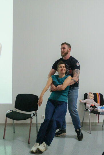 – Есть такой приём – толчок в живот. Встали сзади, чуть наклонили подавившегося, сложили одну руку в кулак, вторую сверху и положили выше пупка. Говорим ему: "На счёт 3 выдыхай" – и делаем резкий толчок в живот. Вы меняете давление в грудной и брюшной полости, тем самым выталкиваете инородное тело, – рассказывает инструктор.