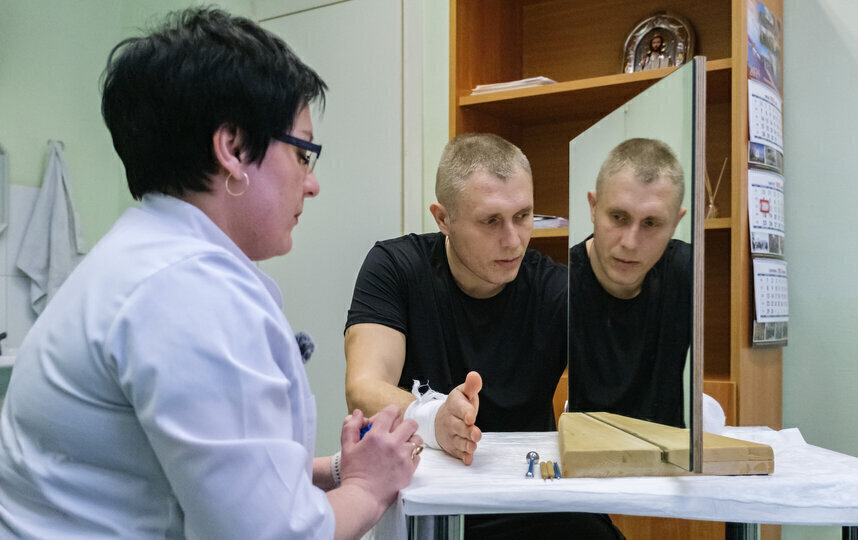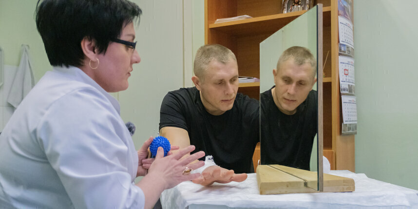 "Фантомно-болевой синдром – это ложные неприятные ощущения, которое бойцы ощущают в усечённой конечности в виде прокола, жжения или сдавливания, – объясняет психолог Марина Иванова. – Чтобы избавить пациента от этого синдрома, мы используем зеркальную терапию. Устанавливаем зеркало, перед ним человек кладёт здоровую руку. Прошу смотреть на отражение, где он видит вторую руку – в образе сохранной. Таким образом мы искусственно создаём визуальную связь, которую в процессе работы подкрепляем стимуляцией и двигательными упражнениями. Мозг воспринимает это как сохранность конечности, закрепляются зеркальные нейроны. Постепенно снимается болевой синдром".