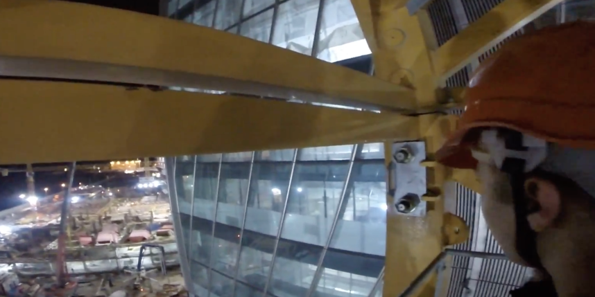 На кадрах видно, что двое молодых людей в форме, похожей на рабочую, и оранжевых касках проходят через ограждение и оказываются на площадке. Как только их окрикивает охранник, они направляются к рабочим. Руферы пытаются "замаскироваться" среди строителей, но их форма отличается. Тогда молодые люди по строительным лесам забираются на кран.