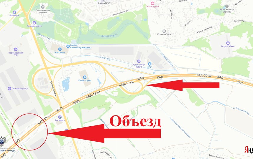 Объезд предусмотрен через разворотную петлю на 17-м километре КАД (с внешнего на внутреннее кольцо) в районе складов ООО "Парголовский ТЛК".